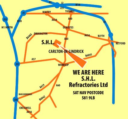 Contact us . . . S.H.L. Refractories (UK) Ltd Celcius House, Lawn Road Ind. Estate, Carlton-in-Lindrick, Worksop, Nottinghamshire S81 9LB T: 01909 731959 F: 01909 731579 Click here to email us